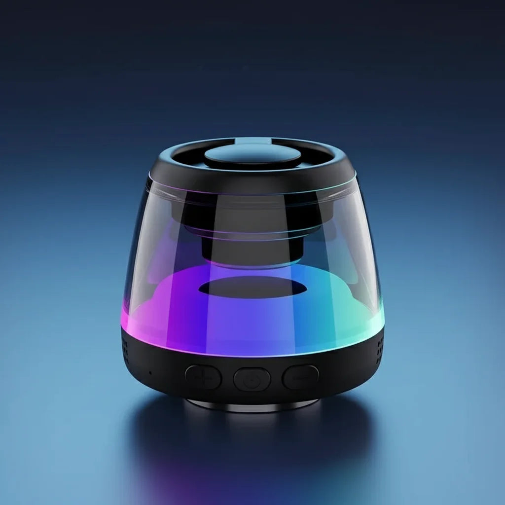 The AuraBeat's RGB lighting cycles through various vibrant colors, adding a dynamic visual element to your listening experience. It's designed to enhance the ambiance and make your music truly pop!